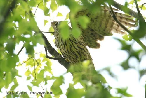 最近お城でよく見られている オオタカ。 私も 先日やっと会えました。 丁度 頭上の枝に止まったのですが 葉っぱがいっぱいで 全身が見えない^^; 何とか隙間から 撮ろうとしたけど どうしても 顔にかかってしまい こんな感じに....。 でも 広げた羽の所々がハ…